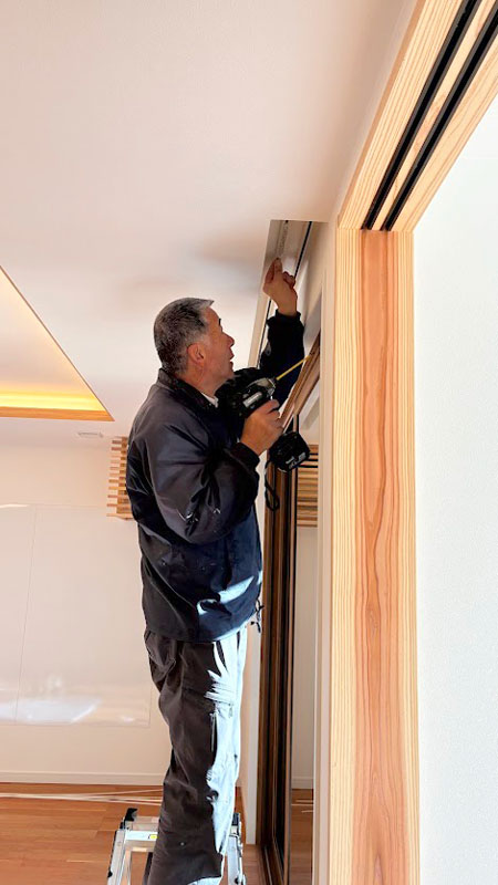 玄関からの仕切りの無垢材の建具とも美しく調和しました。