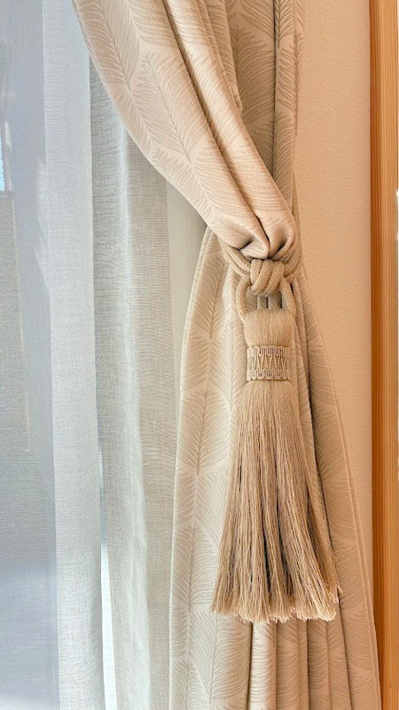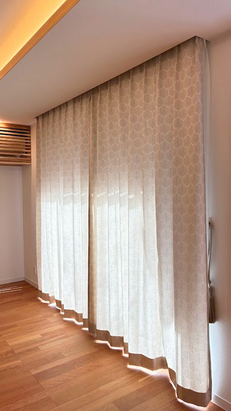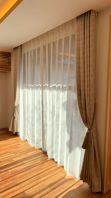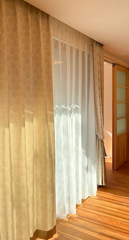 その経年美化した木材と新しい無垢材とが自然につながるカーテン